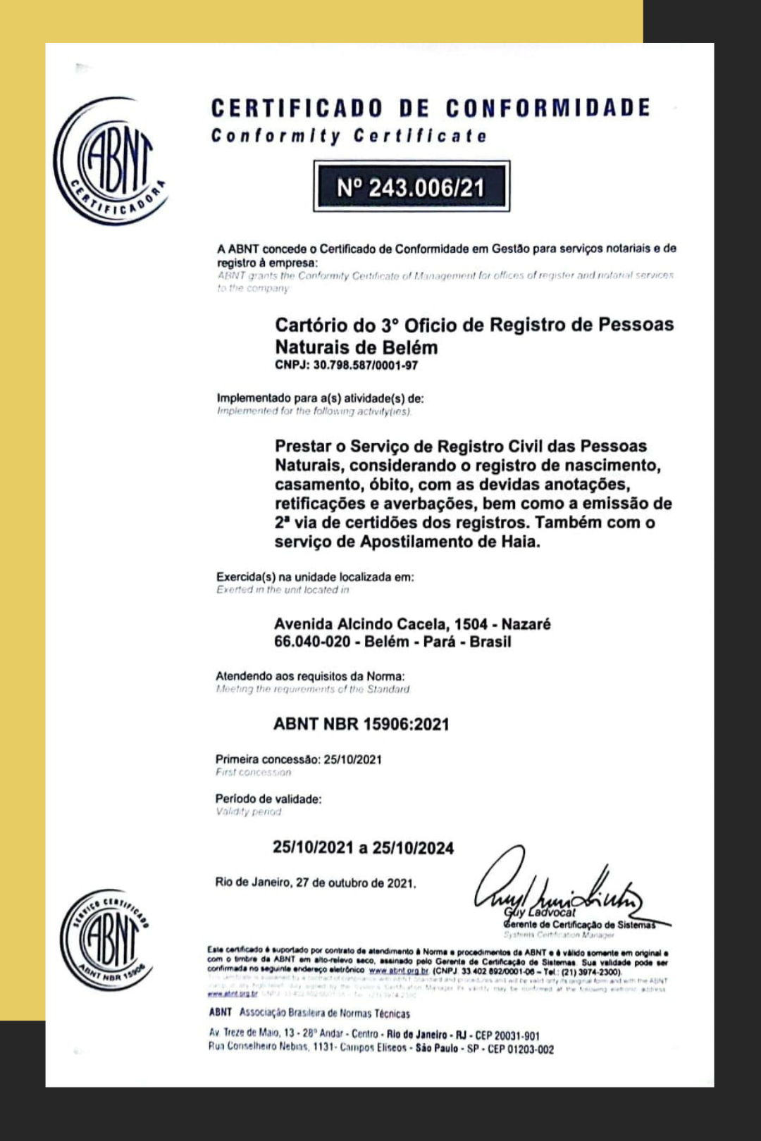 Garantir a segurança jurídica e a cidadania, oferecendo serviços de excelência com empatia e transparência. Buscar a satisfação dos usuários, em conformidade com todas as leis e normas aplicáveis, alinhados à Missão, Visão e Valores da serventia extrajudicial, implantando a melhoria contínua dos processos e serviços por meio de sistemas de gestão de qualidade.